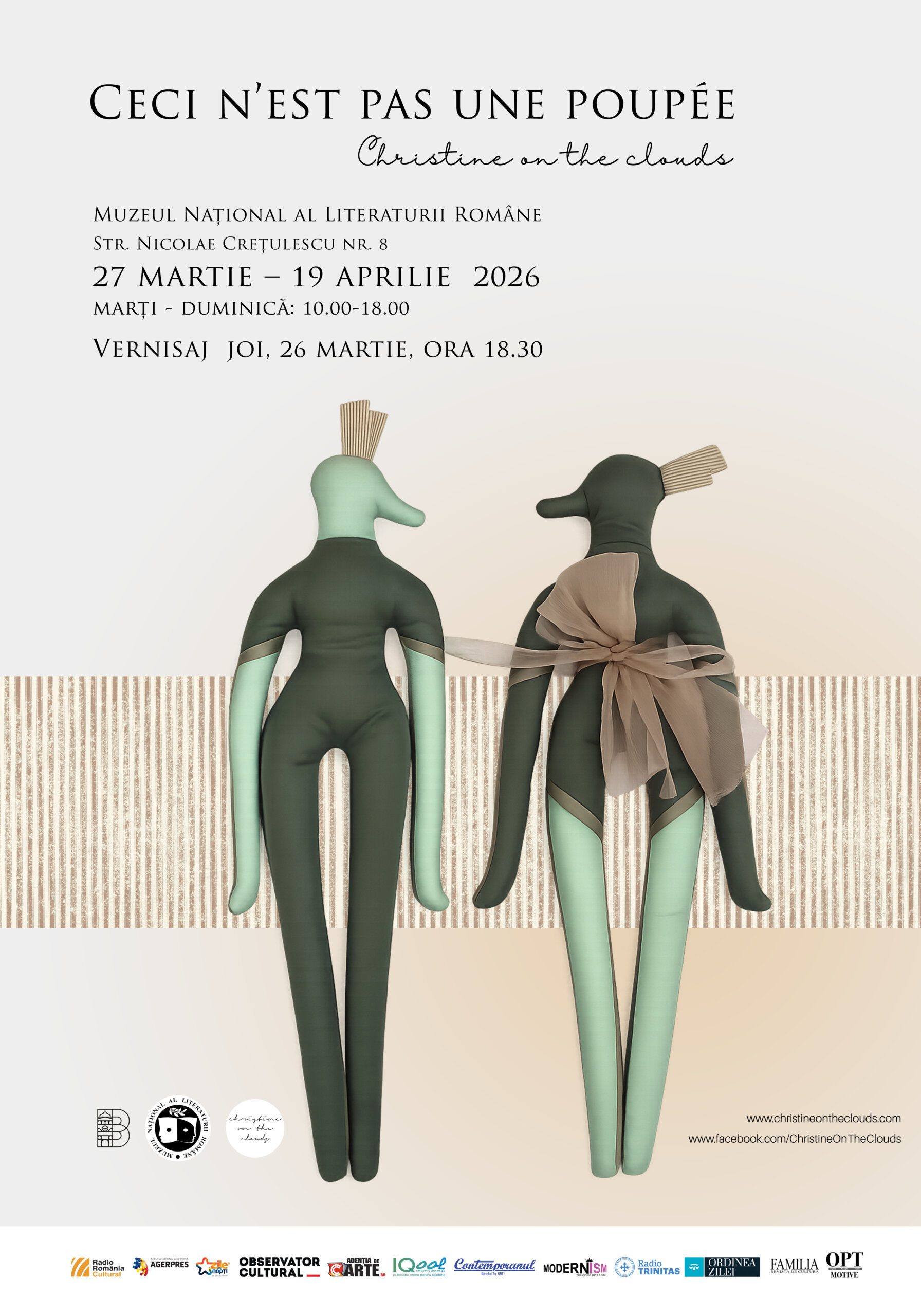 Muzeul Național al Literaturii Române organizează, la sediul său din str. N. Crețulescu nr.8, în perioada 27 martie – 19 aprilie 2026, expoziția „CECI N’EST PAS UNE POUPÉE – Nepăpușile, între ceea ce simți și ceea ce ai putea deveni”, realizată de Cristina Șerbu, fondator al brand-ului Christine on the Clouds. Vernisajul expoziției va avea loc joi, 26 martie 2026, ora 18.30.