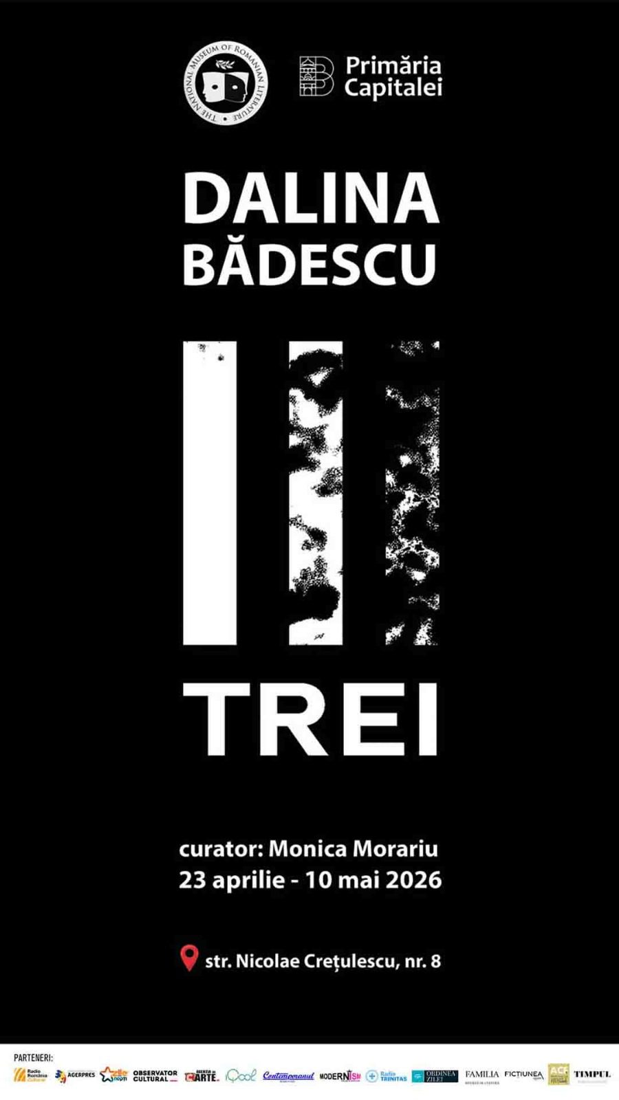 Expoziția „TREI” vă așteaptă la Muzeul Național al Literaturii Române, între 23 aprilie și 10 mai 2026, de marți până duminică, în intervalul orar 10.00 – 18.00. Pentru costul biletelor, consultați https://mnlr.ro/contact/. Intrarea la vernisaj este liberă.