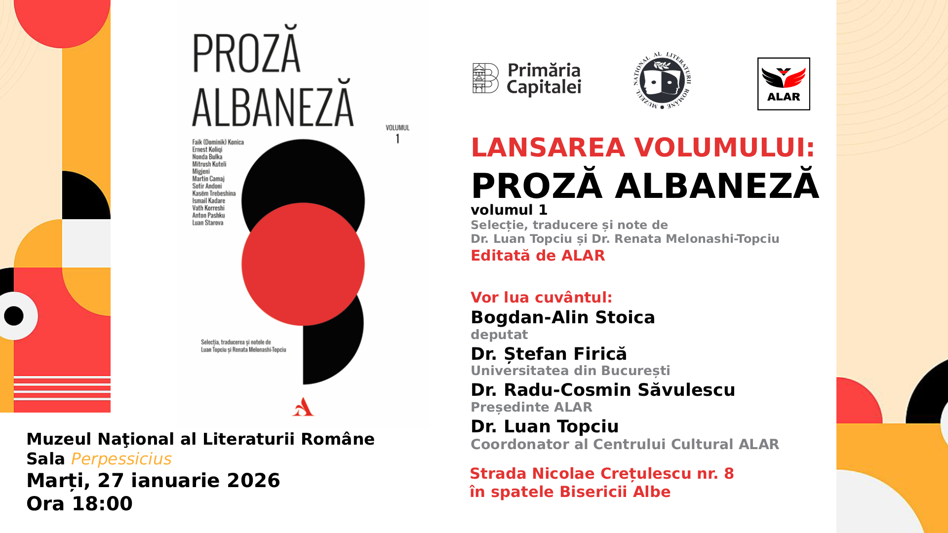 Muzeul Național al Literaturii Române și Editura Asdreni a Asociației Liga Albanezilor din România (ALAR) invită publicul la lansarea primului volum al antologiei „Proză albaneză”, apărut în selecția, traducerea și cu notele realizate de Dr. Luan Topciu și Dr. Renata Melonashi-Topciu.
