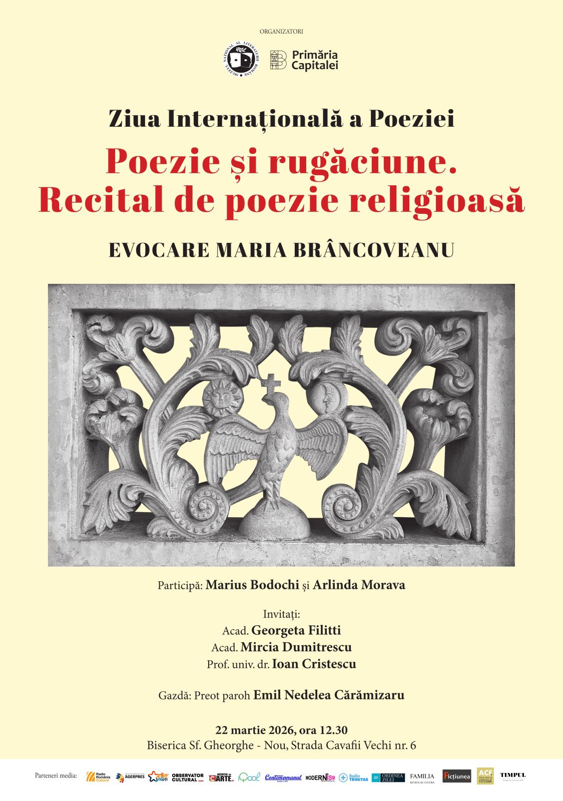 Muzeul Naţional al Literaturii Române vă invită duminică, 22 martie 2026, de la ora 12.30, la Biserica Sf. Gheorghe – Nou (Strada Cavafii Vechi nr. 6), la evenimentul „Poezie și rugăciune. Recital de poezie religioasă”, dedicat evocării personalității și destinului Mariei Brâncoveanu, figură emblematică a istoriei și spiritualității românești.