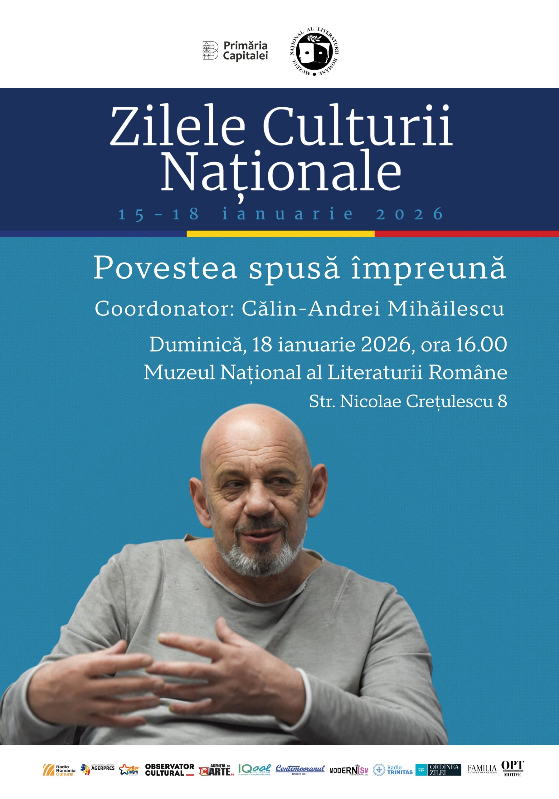 Acasă Actualitate Povestea spusă împreună ActualitateEvenimente Povestea spusă împreună De către Morariu Monica - January 12, 2026 0 73 Participanții sunt invitați să creeze o poveste împreună. Înscrierile se fac în ordinea trimiterii solicitărilor, pe WhatsApp, la nr. 0736598451. Coordonator: Călin-Andrei Mihăilescu. Total Views: 73 ARTICOLE SIMILAREDE LA ACELAȘI AUTOR Actualitate DEZBATERE PUBLICĂ | PATRIMONIUL CULTURAL ÎN ZONELE URBANE Actualitate Agenda Culturală a MNLR pentru săptămâna 14 – 19 aprilie 2026 Actualitate Romanian Haiku / Triplă lansare de carte: o incursiune în estetica momentului Te-ar putea interesa Actualitate Ziua Autorilor Europeni, ediția I Cultura în Direct - March 23, 2023 Muzeul Național al Literaturii Române în parteneriat cu Ministerul Afacerilor Externe și Biblioteca Centrală Universitară „Carol I” organizează luni, 27 martie 2023, ora 11.00,... Urmuz – 140 Actualitate March 10, 2023 Merlich Saia / Viața Anew II Actualitate September 8, 2021 mini – Cafeneaua critică #318 | Vasile Duda și Ion Bogdan... Evenimente March 18, 2024
