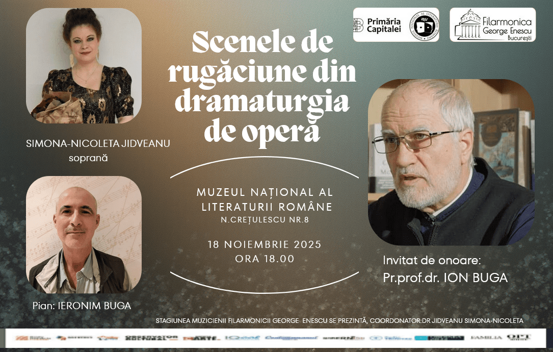 Marți, 18 noiembrie 2025, ora 18.00, va avea loc Stagiunea „Muzicienii Filarmonicii George Enescu se prezintă la Muzeul Național al Literaturii Române”, sediul din strada Nicolae Crețulescu 8. Conceptul evenimentului se intitulează Scenele de Rugăciune din Dramaturgia de Operă și propune ascultătorilor stări de spirit care facilitează întâmpinarea Sfintelor Sărbători ale Crăciunului. De aceea, serata muzicală susținută de soprana Simona-Nicoleta Jidveanu și pianistul Ieronim Buga îl are ca invitat de onoare pe părintele profesor doctor Ion Buga. Dumnealui va oferi un însuflețit comentariu de teologie vie pentru ariile interpretate de cei doi muzicieni ai Filarmonicii George Enescu.